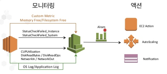 - CloudWatch Alarm을 통해 지정한 Resource 임계값이 초과되거나 미만이 되면 알람을 보내고 지정된 작업을 실행 (Auto Scaling을 통한 EC2 인스턴스 scale in/out)