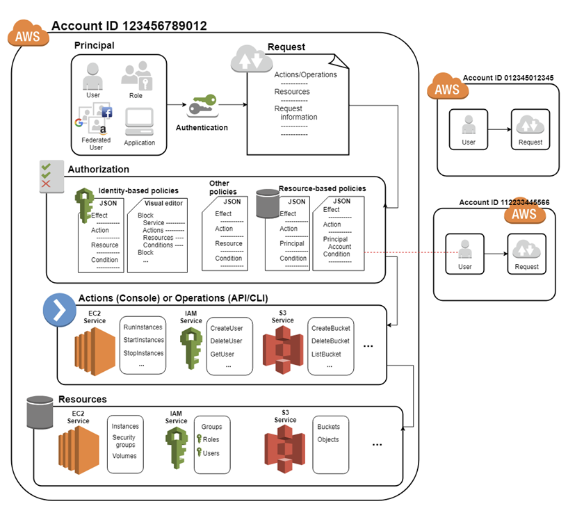 - 보안 주체 : 엔티티(사용자 또는 역활)를 사용하여 요청을 보내는 사람 또는 애플리케이션 (보안 주체에 대한 정보는 보안 주체가 로그인하는데 사용된 엔티티와 관련된 정책이 포함)