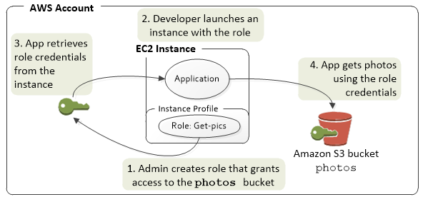 1. 관리자가 IAM을 사용하여 역활을 만들고 이 역활의 정책에는 EC2 인스턴스 만이 해당 역활을 맡을 수 있도록 지정 (정책은 S3 Bucket에 대한 읽기 전용 권한만 부여)