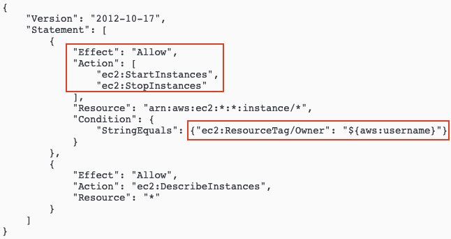 - EC2 인스턴스의 시작 또는 중지를 허용하였지만 인스턴스 태그 Owner가 사용자의 이름 값과 같은 경우로 제한