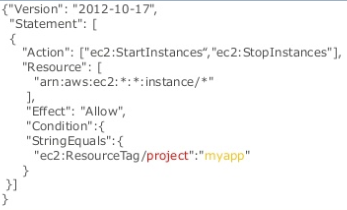 - 지정된 태그 (키 : project, 값 : myapp) 가 붙어 있는 인스턴스만 시작 / 중지 가능