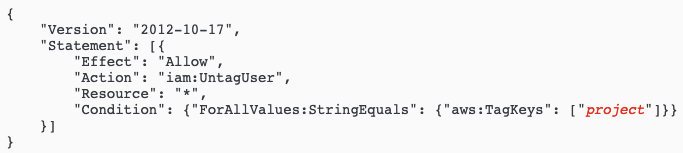 권한 부여 프로세스의 일부 : aws:TagKeys 조건 키를 사용하여 특정 태그 키를 리소스, 요청 또는 보안 주체에서 사용할 수 있는지 여부를 제어 (이 경우 값은 중요하지 않음)