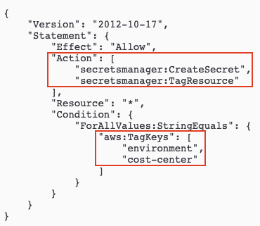 - environment 또는 cost-center 태그가 포함되어 있다면 CreateSecret, TagResource를 허용