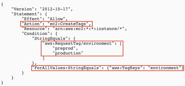 - 태그에 environment, preprod, production 값이 포함된 경우에만 EC2 CreateTags 작업을 사용하여 태그를 인스턴스에 연결할 수 있음