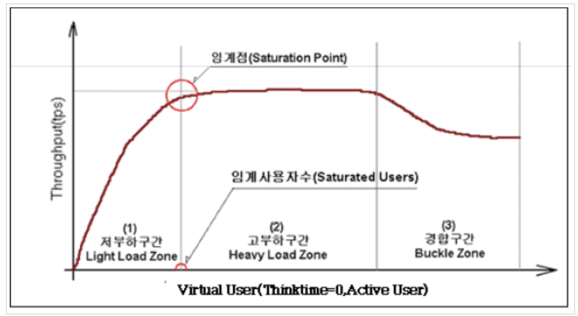 - 시스템은 언제나 처리에 한계가 있으므로 어느 순간에 더 이상 증가하지 않고 그래프가 꺽임