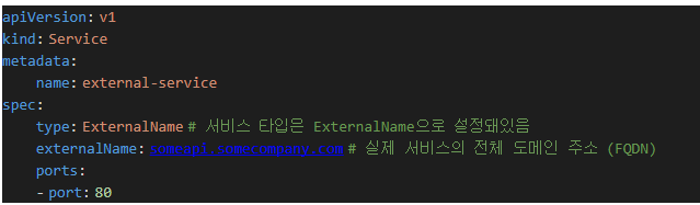 위 방식은 수동으로 서비스와 엔드포인트를 지정한 방식이며 아래처럼 서비스에 ExternalName 형식으로 지정할 수 있다.