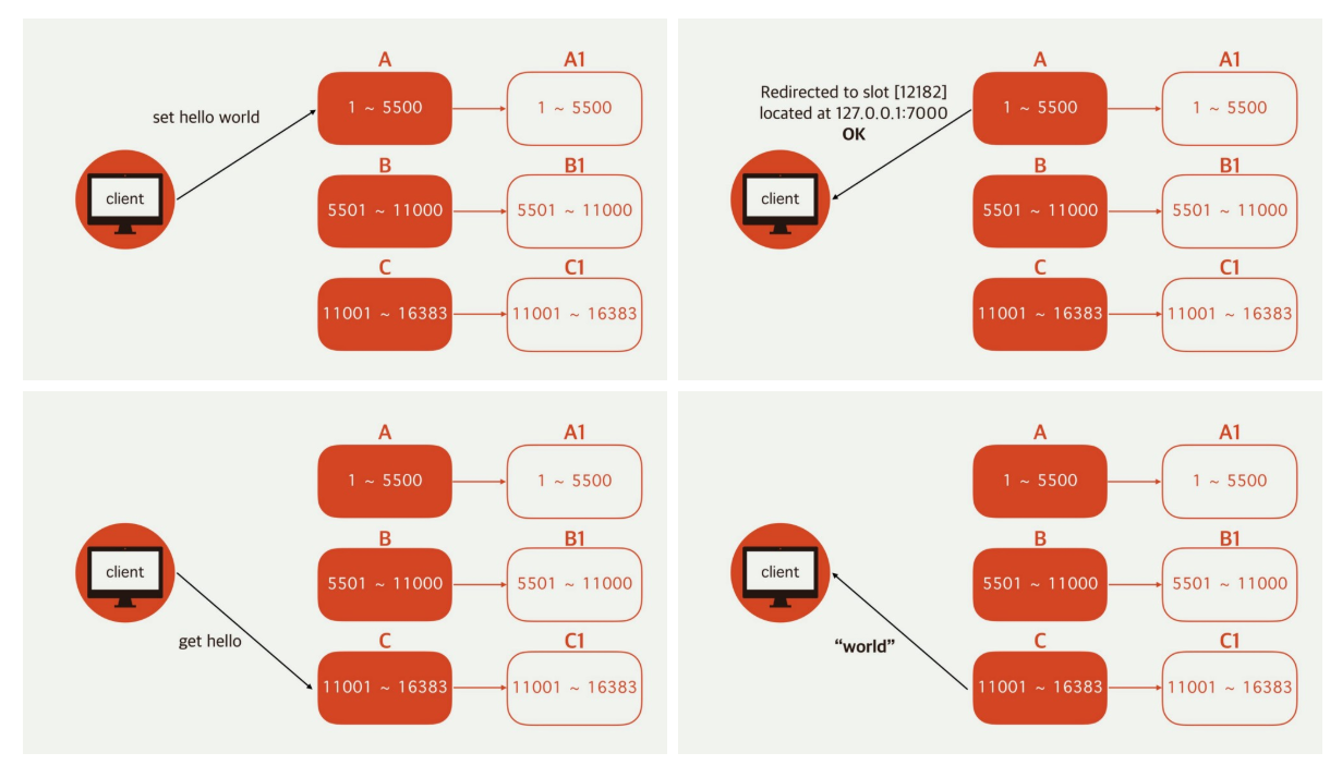 다른 서버에서 질의시 해당 서버는 자신이 가지고 있는 slot이 아니면 client에게 slot을 가진 서버를 리다이렉트하도록 전달한다.