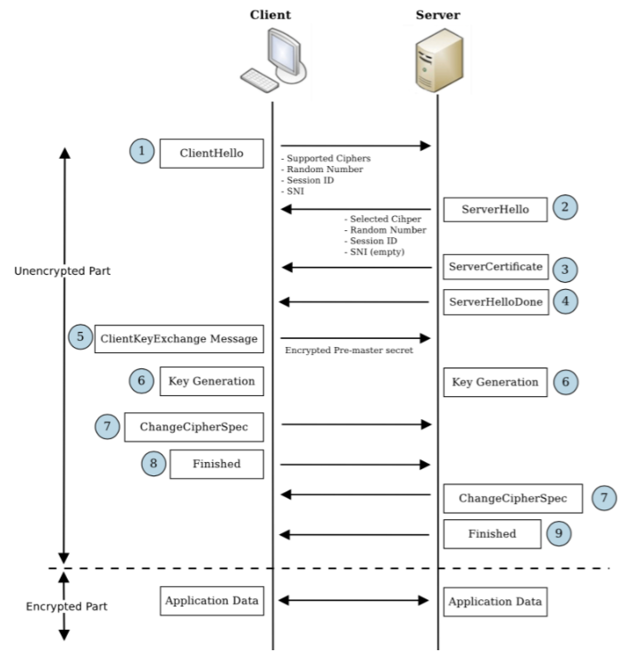 TLS 프로토콜 확장형이고 네트워크을 통하여 TCP 통신을 수행할 시에 SSL/TLS Handshake 과정을 거치는데 이때 Handshake 과정의 시작점에서 웹브라우저에게 호스트명(HTTP Header에 삽입)을 정해준다.