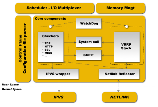 Keepalived는 LoadBalancing 쪽에서 사용되는 LVS(IPVS)와 NAT, Masquerading에 쓰이는 Netfilter와 VIP 할당 및 해제에 쓰이는 Netlink, VRRP Advertisement 패킷 전송을 위해 사용되는 Multicast와 같은 Kernel 컴포넌트로 구성되어 있다.